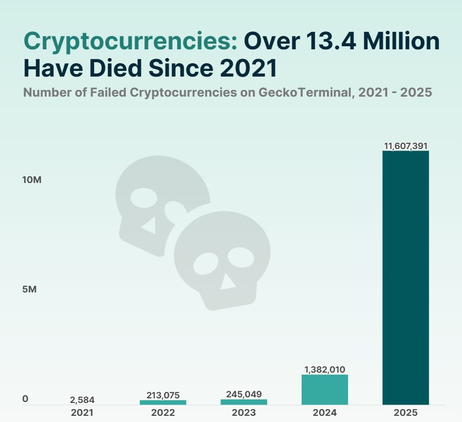 2025 年,是加密货币历史上项目“死亡率”最高的一年,全年有 1160 万个加密项目停止交易,其中 Meme 币是绝对主力。