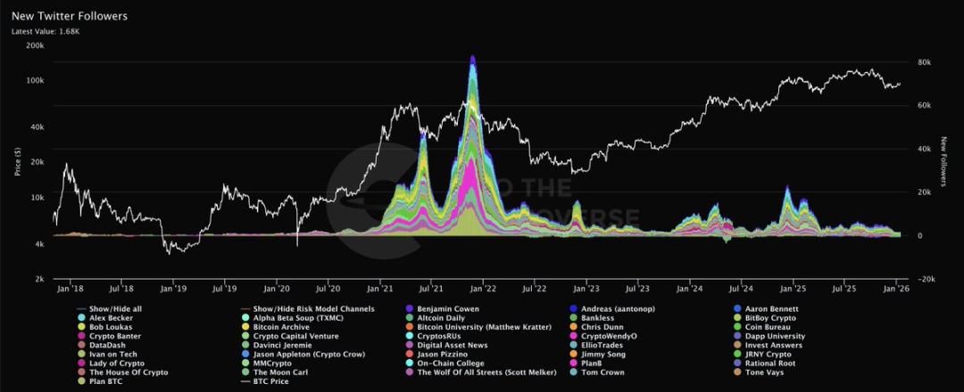看看这张图。这是各大头部 Crypto KOL 的新增关注者(New Followers)数据叠加 BTC 价格(白线)的走势图。