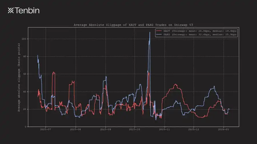 此外,在过去约半年的时间里,XAUT 与 PAXG 在 Uniswap 上的交易平均滑点长期维持在 25–35 个基点区间,且在个别时段甚至会超过 50 个基点。