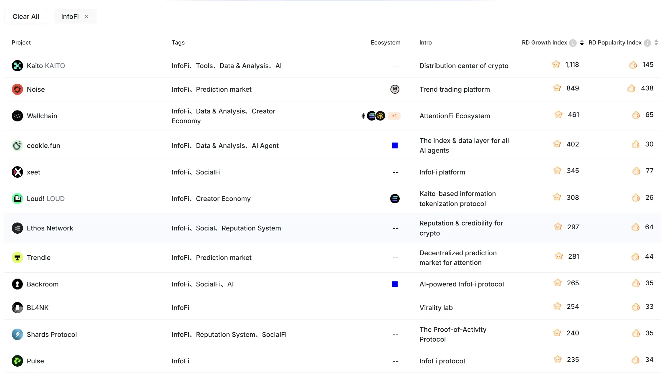 InfoFi 项目列表 来源:RootData