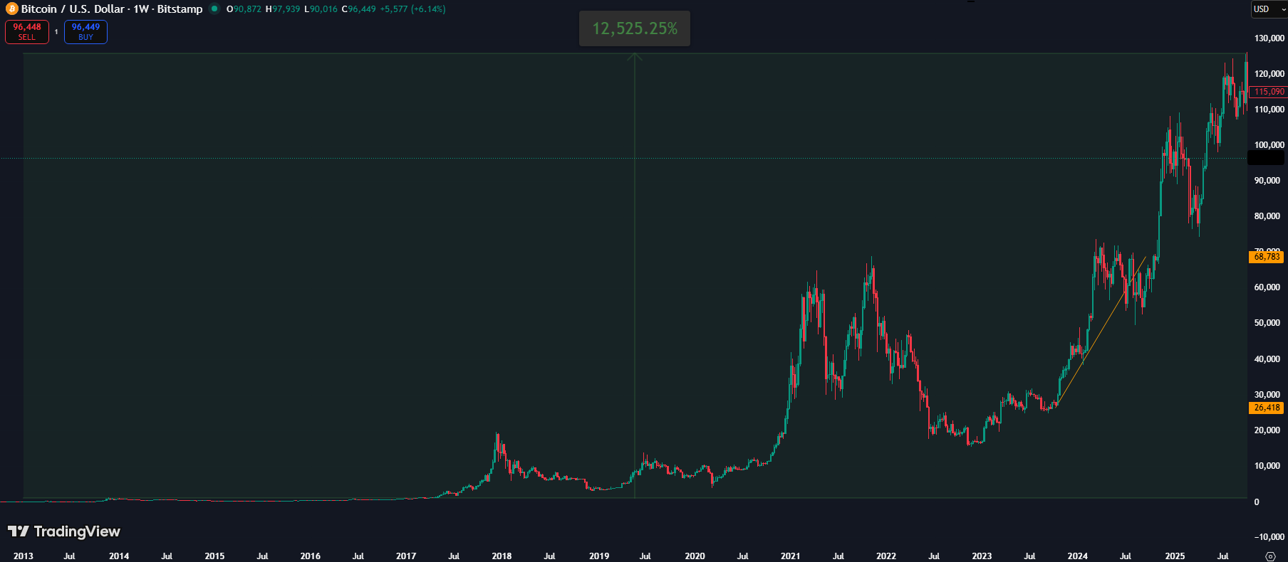 回顾2014年,比特币当年的最高价格为998美元,而与现如今创下的历史最高价126,000美元相比,在短短10余年间,比特币的涨幅超过12,500%,创造了惊人的125倍翻倍纪录。