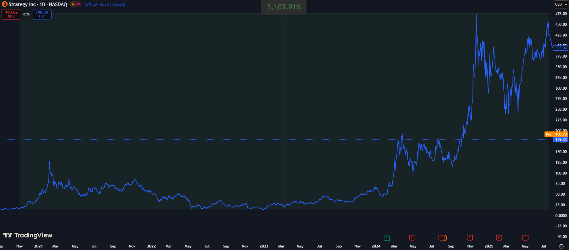 因为该公司的股票MSTR从与比特币挂钩那一刻开始,该公司的股票价格,就开始呈现出倍数级别的上涨。在这5年间,该公司的股票价格最高时上涨超过31倍!