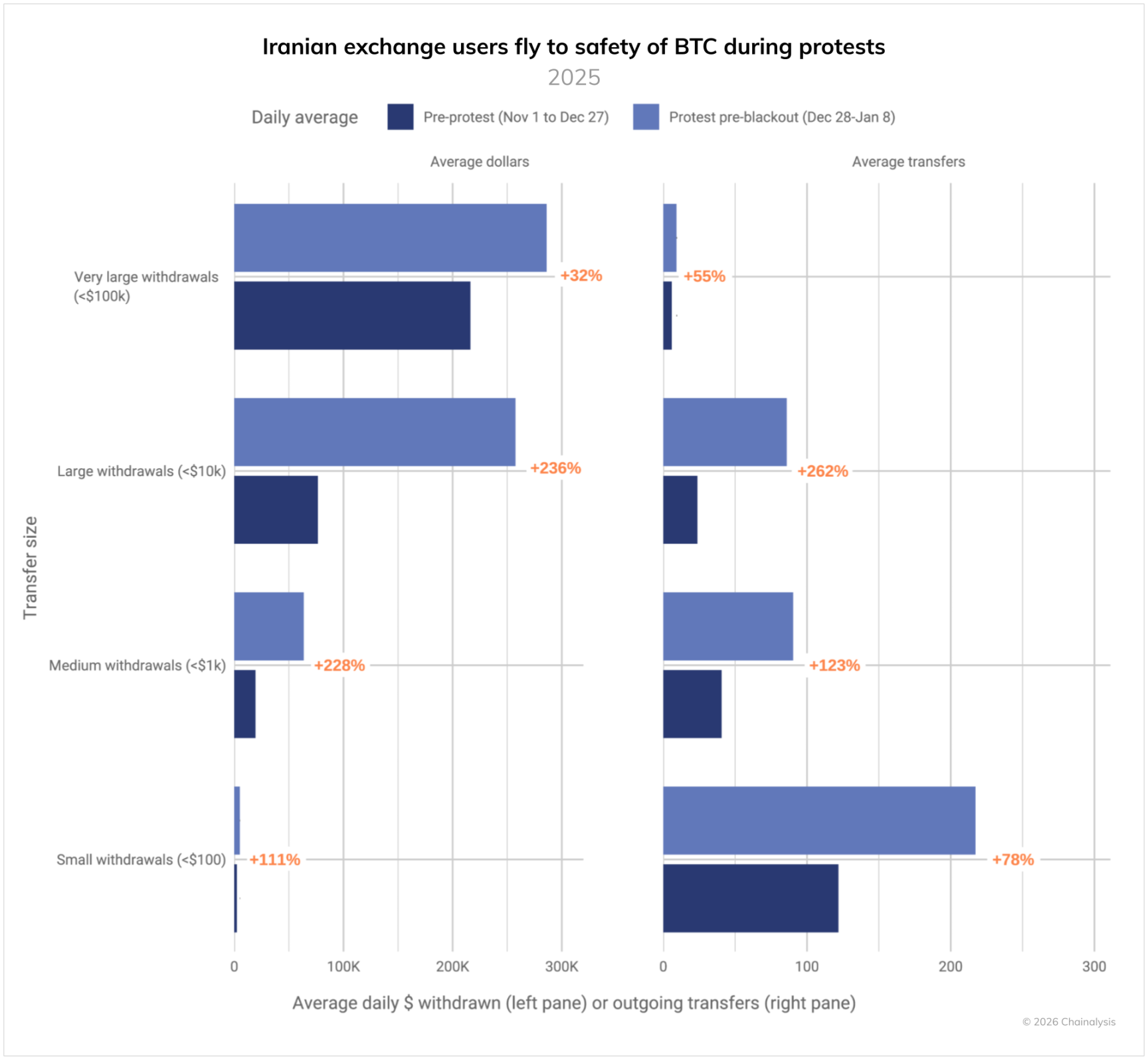 最新数据显示,在当前的大规模抗议运动期间,伊朗民众的链上行为出现了显著转变。对比抗议前窗口期(2025 年 11 月 1 日至 12 月 27 日)与抗议期间(2025 年 12 月 28 日至 2026 年 1 月 8 日,伊朗开始实施全面网络断网)的链上数据,我们发现,向个人钱包转账的日均美元金额和日均交易笔数均出现大幅增长。其中最具代表性的趋势是,从伊朗加密交易所向未归属的个人比特币钱包的提现规模激增。这一现象表明,抗议期间伊朗民众持有比特币的比例,远高于抗议前水平。