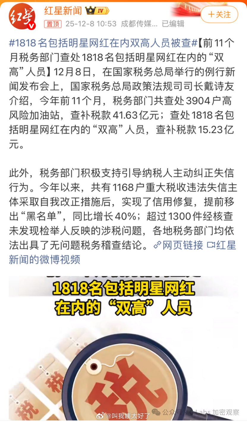 但是社交媒体上的“晒单”、高额收入截图、炫富内容等,也是强有力的线索,足以引起税务部门的关注和启动调查。