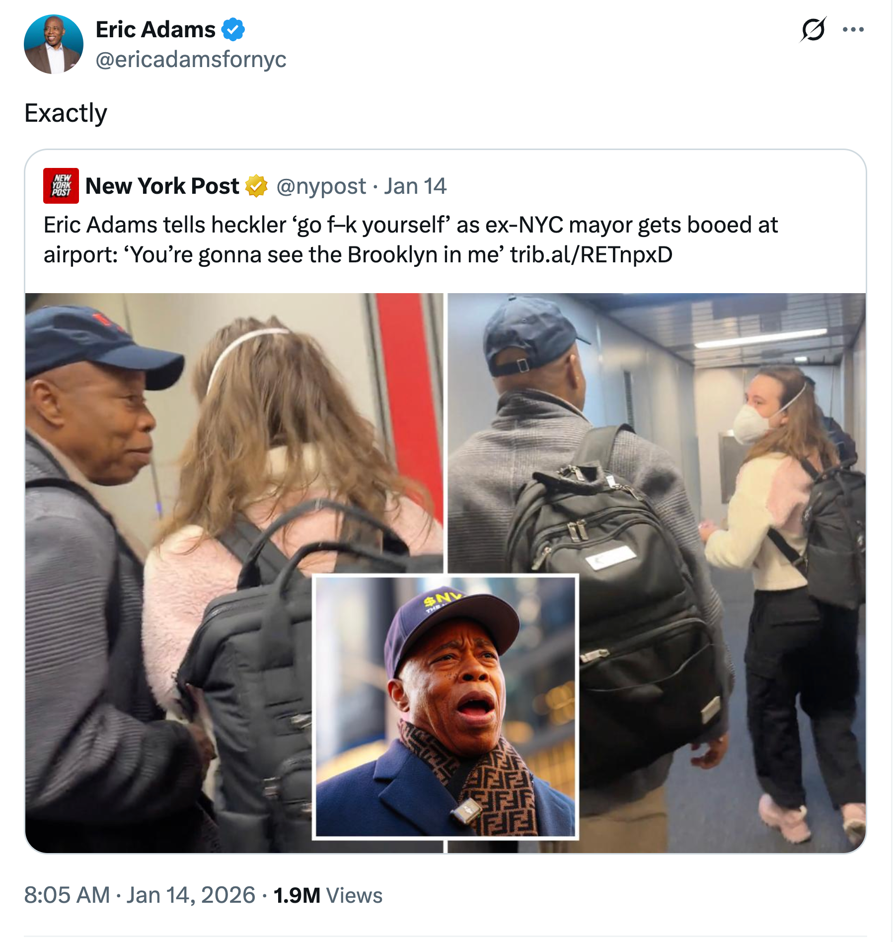 2025年12月对于埃里克·亚当斯来说,在纽约市长任上的最后一个月无比自在。他可以利用职务之便尽情享受旅行,借机实现儿时环游世界的梦想。被指责为患上“市长退休综合症”的亚当斯,先后访问了阿尔巴尼亚、以色列和乌兹别克斯坦,并飞往新奥尔良欣然接受了“反对反犹太主义运动”颁发的奖项。