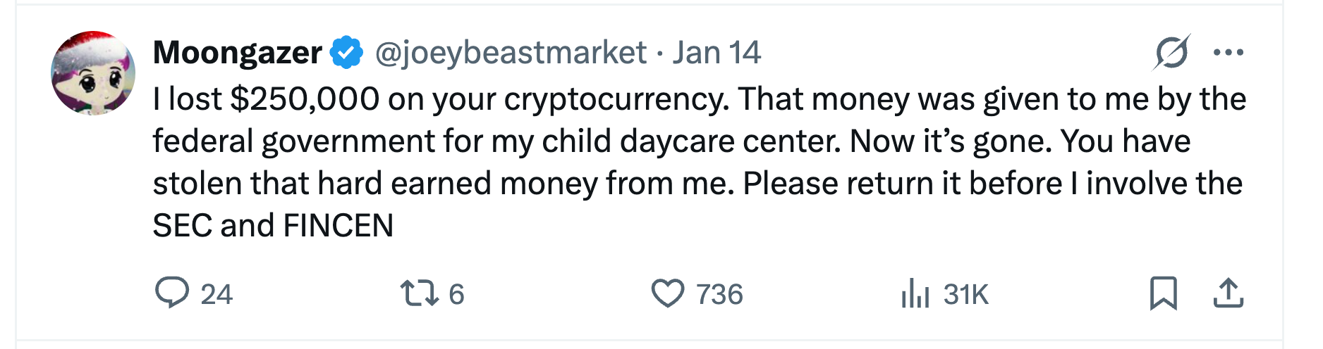 还有一种推测是,NYC Token只是亚当斯接受贿赂的通道,发表此类观点的人认为,很难相信还会有人会傻到辨别不了这种明显的骗局。不过,在亚当斯X账号发布的相关推文下,也还是能见到疑似投资者在要求退款,弥补损失。
