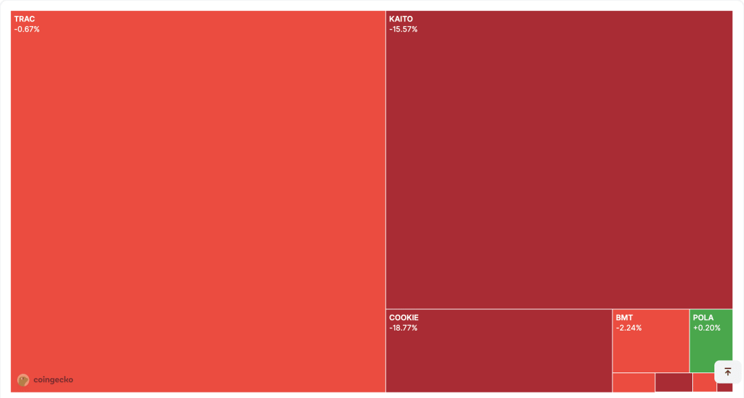X平台的“禁令”发布后,市场反应迅如闪电。作为InfoFi赛道的龙头项目,Kaito.ai的治理代币$KAITO应声暴跌。其价格在短短数小时内从0.7美元附近下跌至0.52美元,24小时跌幅超过20%。另一知名项目Cookie DAO的代币$COOKIE也同步走低,整个InfoFi板块市值在24小时内蒸发超过12%。