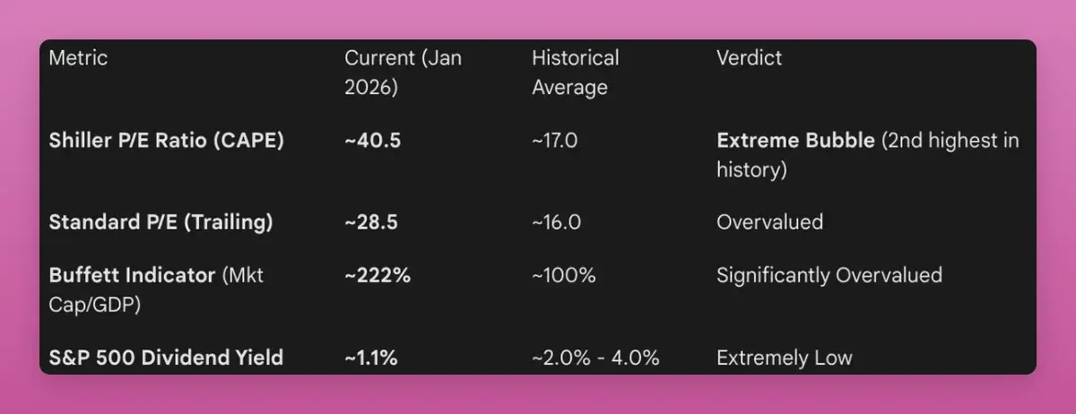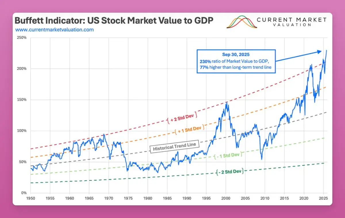 重点: 目前美股 市盈率(P/E Ratio)为 40.5 倍,高于 1929 年大崩盘前的 32 倍。根据沃伦·巴菲特最看重的指标——总市值与 GDP 之比,目前已达 230%,比长期趋势高出 77%(1929 年该比例为 130%)。