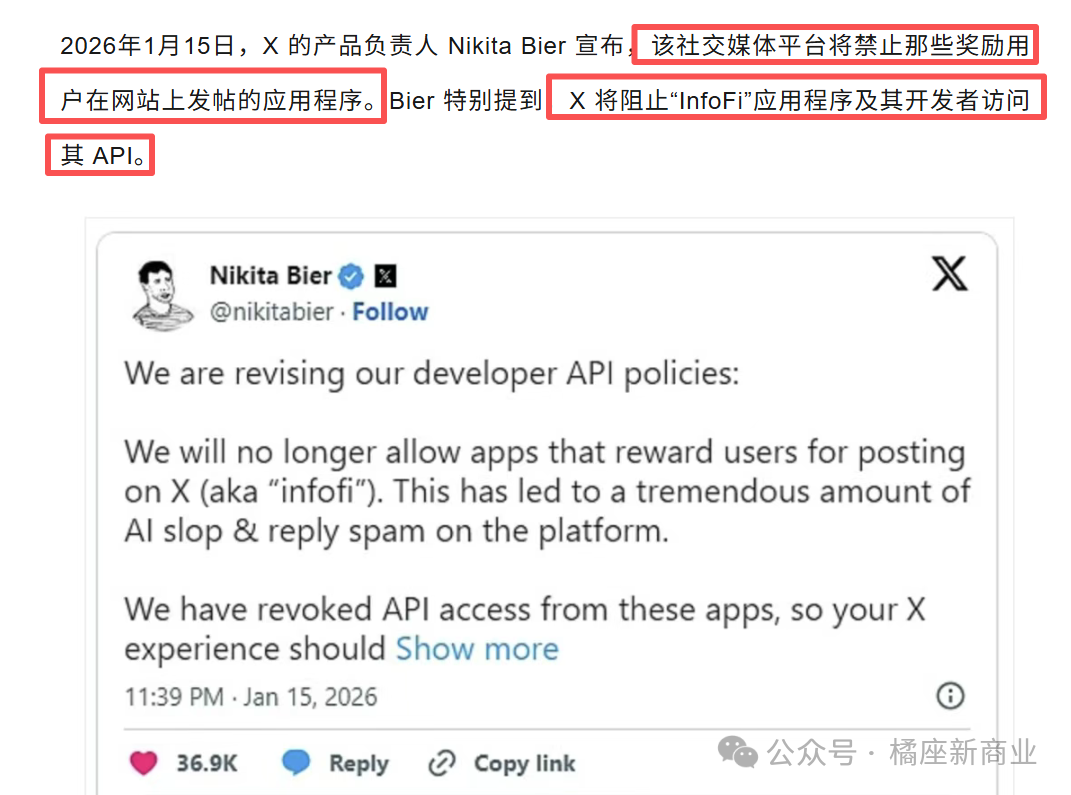 X的产品负责人发文表示,要禁止这些奖励用户发帖的产品,并且要组织这些开发者使用X的API。
