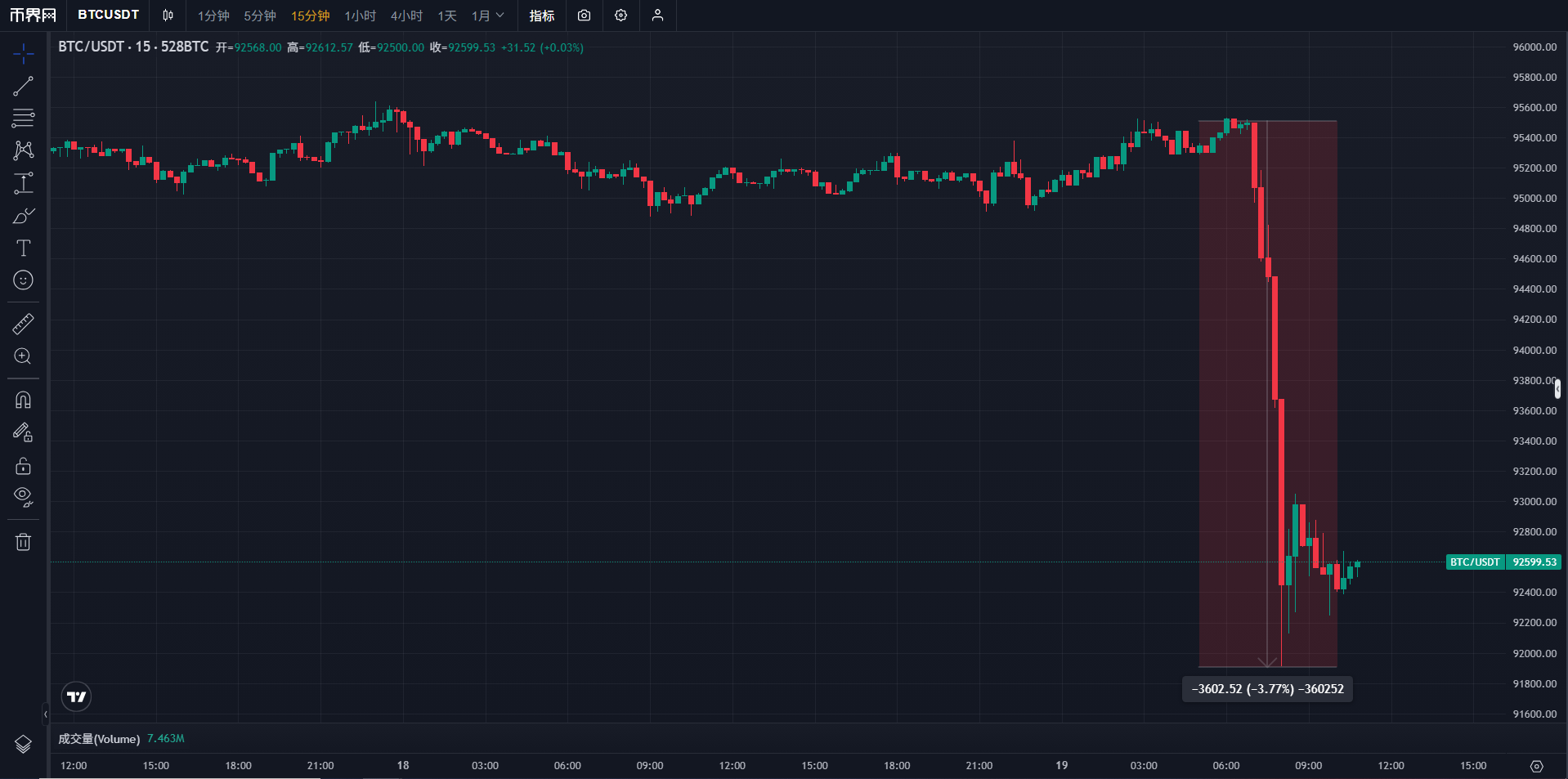 因此,在美国宣布对8个欧洲国家加征关税后,比特币在短短一小时内暴跌近4%,一度跌破92,000美元,带动整个加密货币市场同步下跌,属性典型的“利空消息导致急跌”。