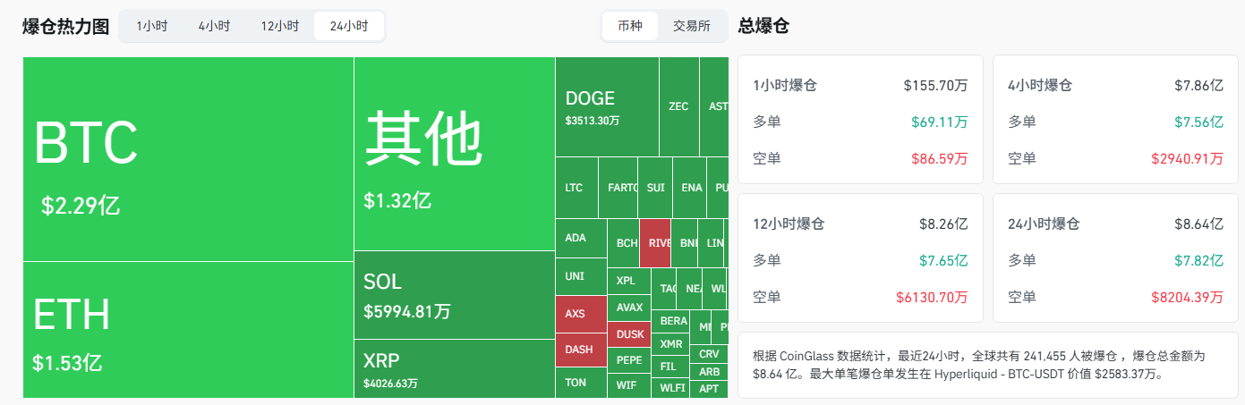 而根据CoinGlass的数据统计显示,在宏观利空因素导致比特币暴跌的情况下,全球共有241,397名投资者遭遇了被爆仓,整个加密货币市场被爆仓总金额高达8.64亿美元。