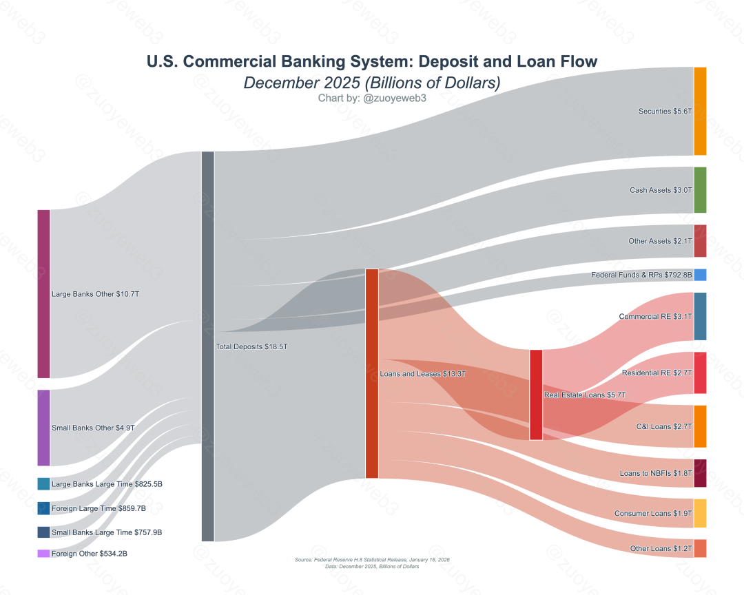 面对 Coinbase USDC 高达 3.35% 年化收益,银行业的辩护理由有两个,其一是美国银行业的存款规模高达 18 万亿美元,如果活期存款利率过高,则银行业会进一步提升贷款利率,最终提高企业融资和个人信贷成本。