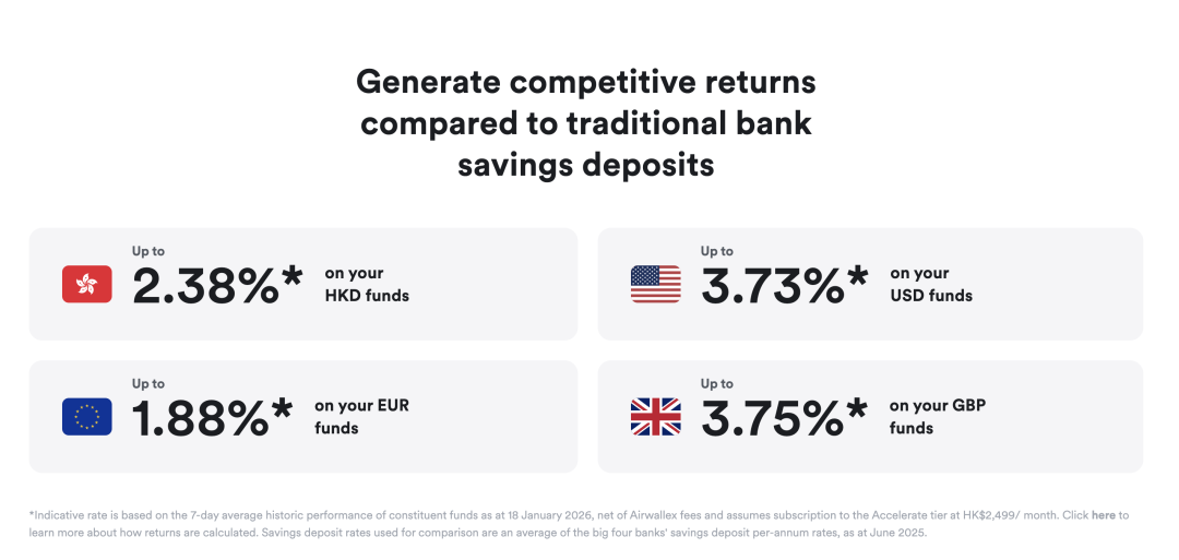 以 Airwallex 的 Yield 产品为例,其不仅能提供比 Coinbase USDC 存款更高的年化收益,还可支持商户多种币种的收益产品,底层由货币市场基金支撑。