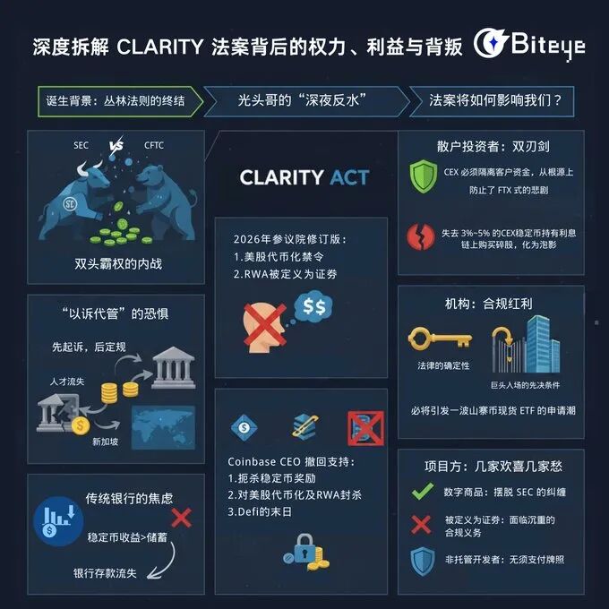 2026年初,在经历了5 年监管拉锯、上百起执法案件之后,全球加密货币市场的目光都聚焦在华盛顿国会山。这一份名为 CLARITY 的法案,本意是为长期处于监管灰色地带的数字资产提供一份清晰度,却在最后关头演变成了一场新旧金融秩序的终极博弈。