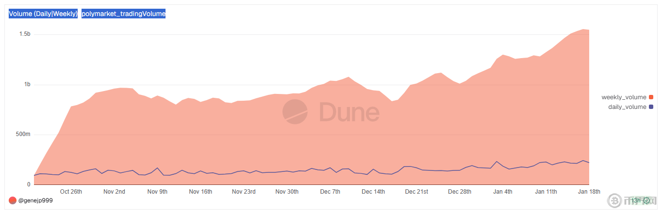 Polymarket交易量 (每日|每周),来源DUN