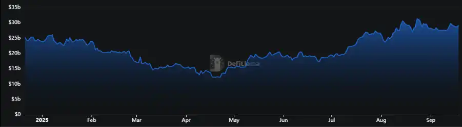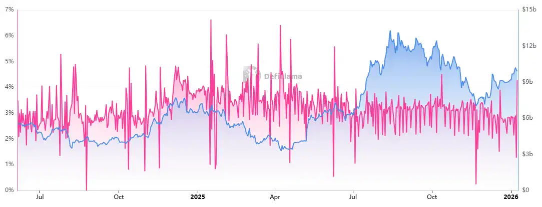 EtherFi 的收益来源包括以太坊网络的原生质押奖励和通过 EigenCloud 的再质押机制获取的额外收益。平台还从用户的质押收益中收取一定比例作为平台收入。据 DefiLlama 数据,EtherFi 的总 TVL 约为 87.03 亿美元,平均年收益率为 4.29%。从时间序列上看,EtherFi 的收益率整体表现相对平稳,而其 TVL 在 2025 年中期出现阶段性扩张,随后回落并进入区间震荡。