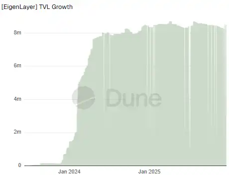 一个更细节的观察点是,从下图 EigenCloud 的原生再质押中 ETH 的总锁仓量(TVL)增长趋势上看,自 2024 年 1 月到 6 月,EigenCloud 引来井喷式增长后,其 ETH 的总 TVL(即占比最大的原生再质押)一直维持在 800 万美元的区间波动,后期并未有更大的增量涌入。
