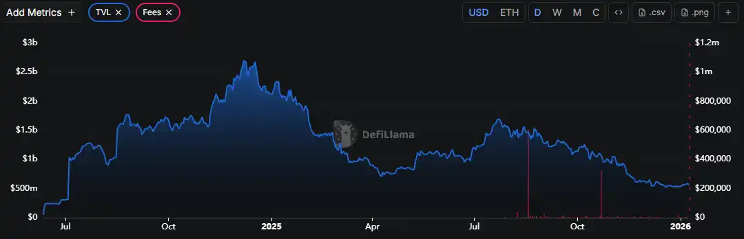 值得留意的是,Pendle 自在 2024 年年初开始,其交易量有指数级增长。截止至目前,Pendle 累计交易规模已接近 900 亿美元,整体增长节奏较为平滑,未出现剧烈回撤。这表明 Pendle 的交易活动并非由单一事件或短期激励驱动,而是伴随产品使用场景扩展与用户活跃度提升逐步累积。