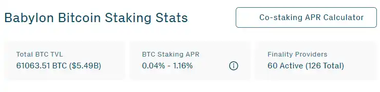 截止至目前,Babylon 已在协议中锁定约 61,063 枚 BTC,是当前规模最大的 BTC 再质押协议之一。目前,Babylon 在再质押协议中 TVL 居第二位。Babylon 质押的 BTC 总量约占比特币流通供应量的 0.31%,质押收益率为 0.04% - 1.16%,活跃验证者数量达到 60 家。