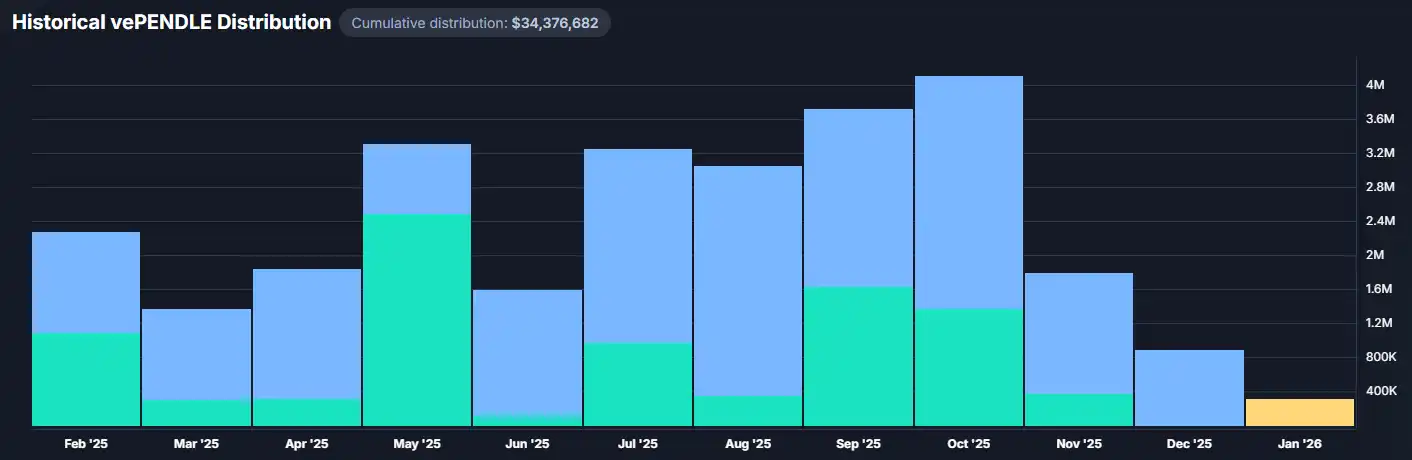 在收入方面,Pendle 通过两条路径获取收入。一是对 YT 累积收益收取 3%–5% 的协议费,这部分收益来源稳定,与市场波动相关性低;二是在 PT/YT 的交易中收取手续费,这也是收入主要来源。这两部分收入全部返还给锁仓的 vePENDLE 用户,没有留给协议团队,这种完全分润机制提高了治理代币的持有价值。