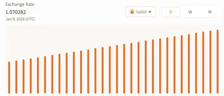 初始阶段,1 haSUI 对应 1 SUI;随着质押收益的持续累积,汇率逐步提升。目前,该汇率已稳定上升至约 1.07,代表每 1 枚 haSUI 背后实际对应的 SUI 资产已较初始增长约 7%。这种机制有效实现了自动复利,使用户无需频繁手动提取和再质押收益,适合长期持有者持续积累回报,也体现了 Haedal 质押机制的稳健性和透明性。