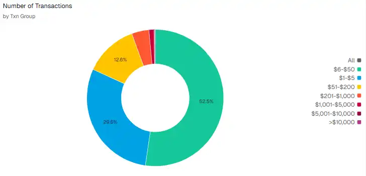 比较有趣的是,EtherFi Cash 业务自推出以来,得到了市场的迎合。据 Dune 数据,该业务已累计消费金额约 1.97 亿美元,共完成 236 万笔交易,累计发放返现约 775 万美元,活跃卡片数量达到 4.69 万张。整体来看,交易频次与活跃卡数表明该产品已进入实际使用阶段,而返现规模相对可控,说明当前激励更多起到用户获取与留存作用,也反映出其支付场景正处于稳步放量的阶段。值得留意的是从使用情况看,持卡用户都是小额试探性的消费为主,交易频次较多的金额集中在 6—50 美元左右。