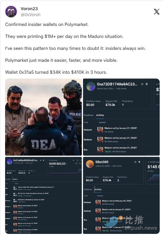 “他们在马杜罗事件上每日获利超过100万美元。这种模式我见过太多次,毋庸置疑:内部人士总是赢家。Polymarket只是让它更容易、更快、更显眼。钱包0x31a5在3小时内将3.4万美元变成41万美元。”