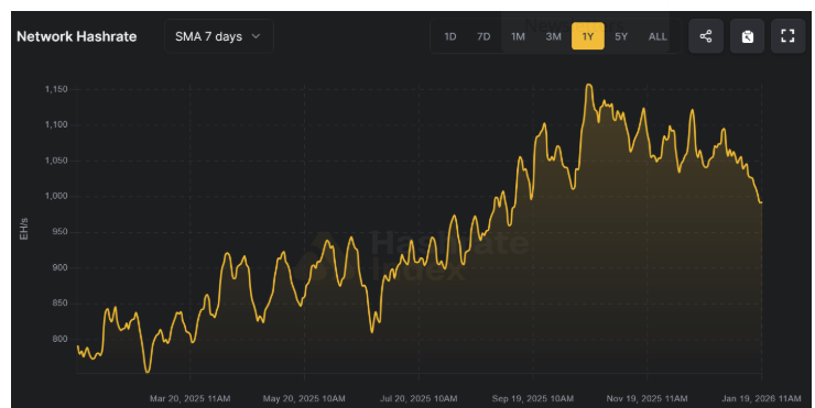 近期,比特币全网算力出现了一轮引人注目的回调。根据区块链监测平台Hashrate Index的数据,比特币网络算力七日移动平均值已从2024年四季度的历史高位回落约15%,一度跌破1000 EH/s的关键心理关口。其背后折射出一个深刻的行业趋势:越来越多的比特币矿工正在将宝贵的电力与算力资源,重新部署到人工智能(AI)计算领域。