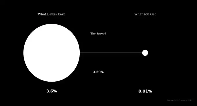 截至 2026 年初,美国储蓄账户平均年化利率为 0.47%,而摩根大通、美国银行等大型银行的基本储蓄账户利率仅为 0.01%。同期,无风险的 3 个月期美国国债收益率约为 3.6%。这意味着大行可以吸收存款、购买国债,轻松赚取超过 3.5% 的利差。