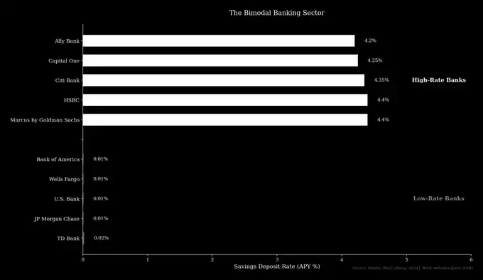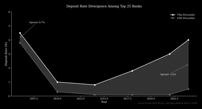 研究显示,美国前 25 大银行的存款利率差异已从 2006 年的 0.70% 扩大至目前的 3.5% 以上。