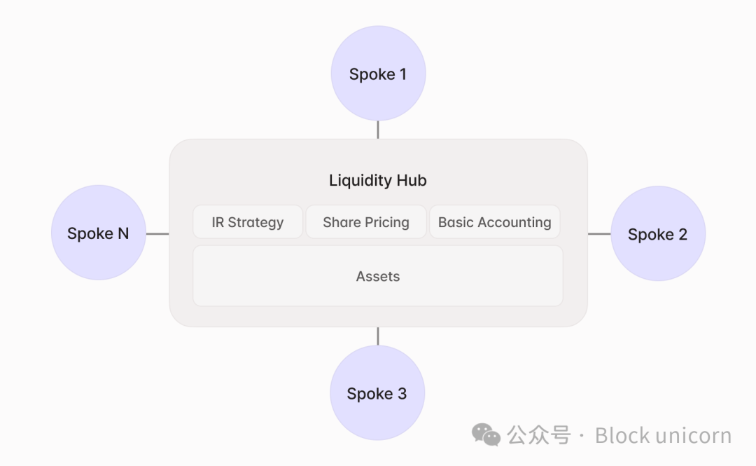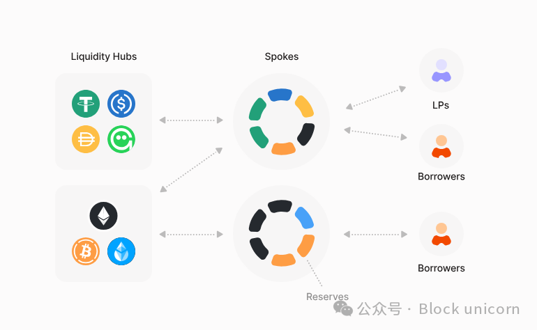 接下来,Aave v4 不再使用“市场”的概念,而是引入了 Spokes(分支节点)。Spoke 并非流动性池,而是一套规则,用于决定谁可以在何种条件下以及承担何种风险限制下获得流动性。用户借款时,并非直接从 Spoke 借款,而是通过 Spoke 从 Hub 借款。