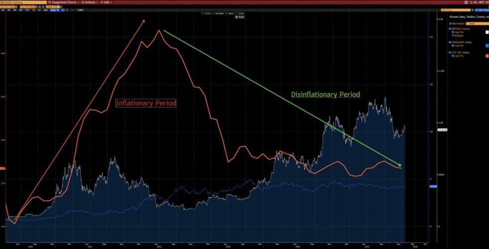 从下方图表中可以看出,自 2020 年以来,比特币与 CPI 同比变化呈现出明显的负相关关系 —— 在通胀上升周期中,比特币往往下跌;而在通胀放缓周期中,比特币则倾向于上涨。