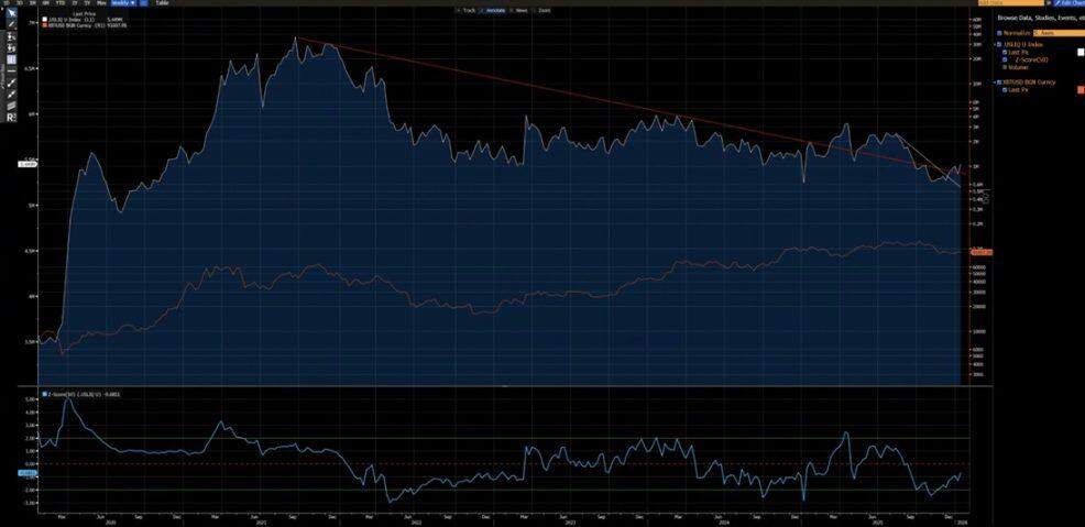 从下方另一张图表中还可发现,自 2020 年以来,比特币与美国流动性指数的相关性极强(2024 年因 ETF 资金流入导致的数据偏差除外)。目前,美国流动性指数已突破短期(白色线)与长期(红色线)下降趋势线 —— 新的上升趋势已现端倪。
