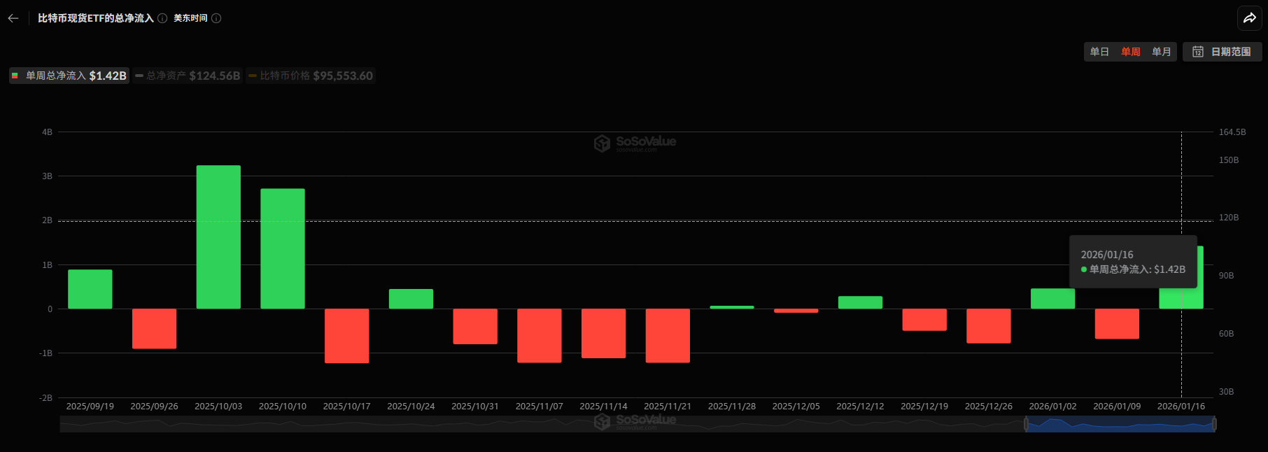美国比特币现货ETF在上周的表现,可以说是十分强劲!创下了自2025年10月10日以来的三个月内单周最大资金净流入记录。全美所有的比特币现货ETF周净流入资金总额共计14.2亿美元。这一数据也展现了华尔街对比特币的强烈需求与信心逐步回升。
