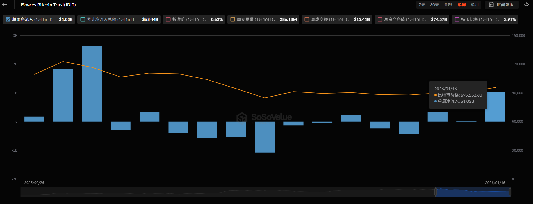 与此同时,上周净流入资金最多的美国比特币现货ETF依然是全球最大资产管理公司贝莱德(BlackRock)旗下的现货ETF--IBIT,该现货ETF的上周净流入资金高达10.3亿美元,占据了上周约73%市场总净流入资金的份额,这也表明了美国投资者对该ETF产品的价值回升和潜力。