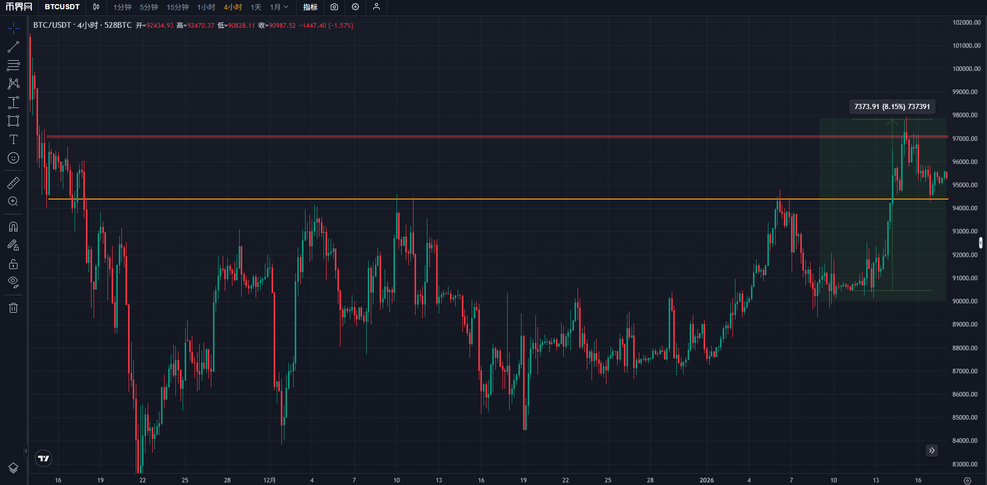 周一至周二,比特币价格平稳起步,维持在90,000美元至92,000美元的区间内进行短线窄幅震荡。此时,市场主要在消化前一周的整理吸筹情绪,缺乏大的波动和突破,市场情绪较为谨慎,更多的是在等待进一步的市场信号。