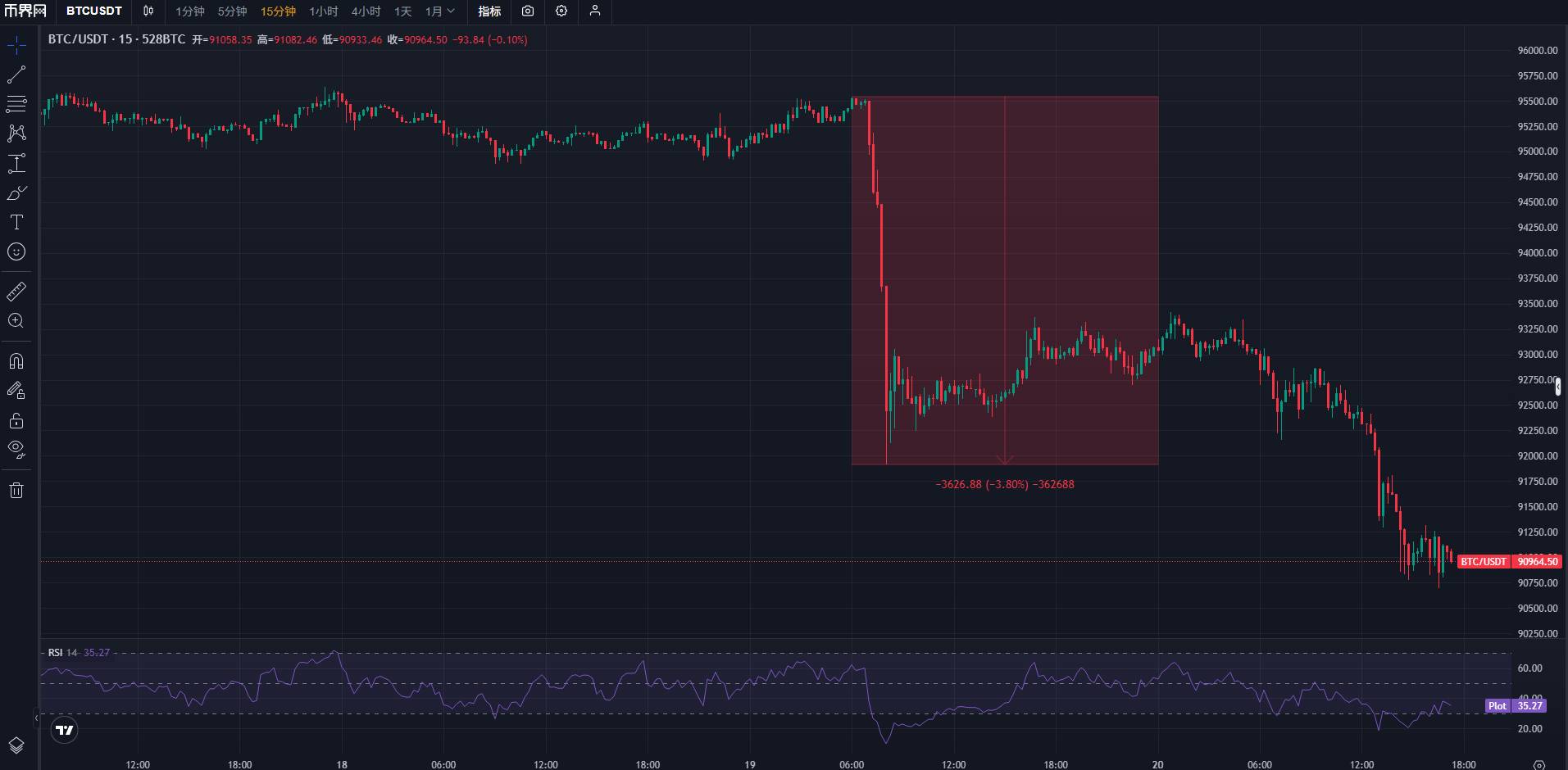 比特币价格在周一早盘快速崩盘,迅速失守了在上周重新站上的关键价位95,000美元以上,价格一度下探至91,900美元附近,创下单日最大跌幅-3.8%。而在撰写本文时,比特币价格已经跌破了91,000美元,这进一步加剧了加密货币市场的悲观情绪。