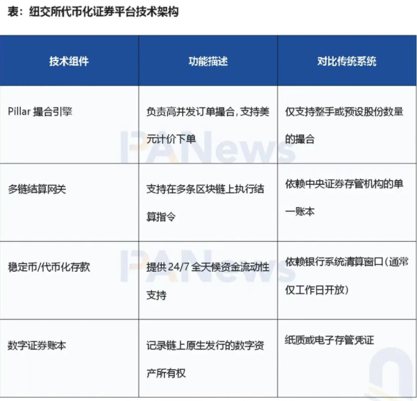 纽交所计划推出的代币化证券平台在技术路线上采取了一种“高性能匹配+链上最终性”的混合架构。这一设计的核心在于利用已有的Pillar匹配引擎处理高频订单撮合,来保证交易的公平性和速度,而将清结算环节迁移至区块链上,从而实现24/7交易。