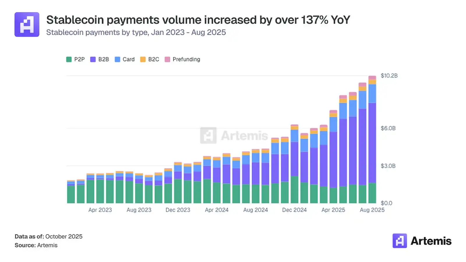 稳定币支付已进入新的增长阶段。月交易额从 2023 年 1 月的 19 亿美元增长至 2025 年 8 月的 102 亿美元,这得益于新兴市场对稳定币支付的持续需求、用户界面 / 用户体验的改善以及机构对稳定币支付渠道的接受度不断提高。