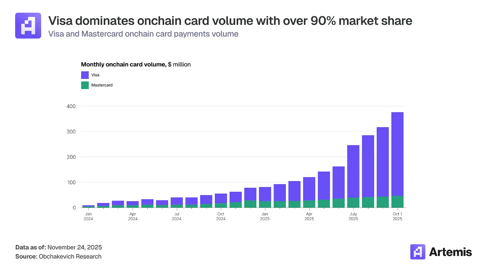 尽管双方的支付项目数量相近,但 Visa 在链上交易量中所占份额却远超对手。这种差异反映了双方不同的市场策略。