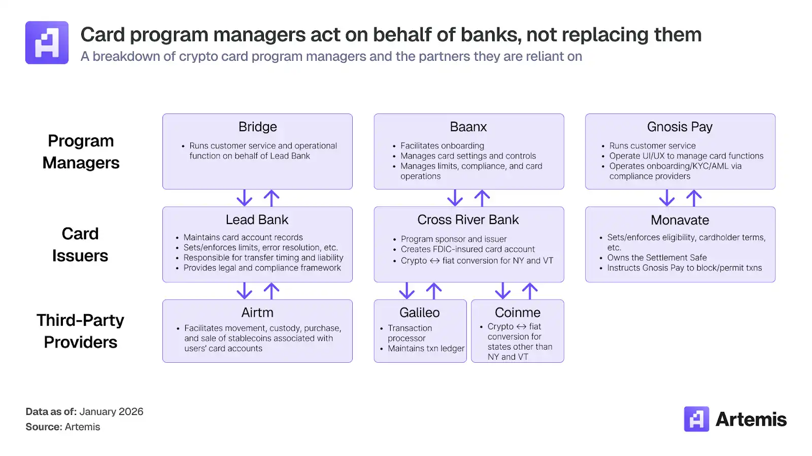 项目管理平台通常与持有 Visa 或万事达卡主要会员资格的发卡银行合作,管理 BIN 赞助关系,处理合规要求,并运营从用户创建的银行账户到所需支付网络的结算系统。各个项目管理平台负责将用户关联数字钱包中持有的加密资产或稳定币转换为法定货币,使其与发卡银行的结算基础设施兼容。项目管理平台提供白标功能,使其他公司能推出自有品牌的卡产品。这些白标卡项目管理公司的例子包括 Baanx、Bridge 和 Gnosis Pay。
