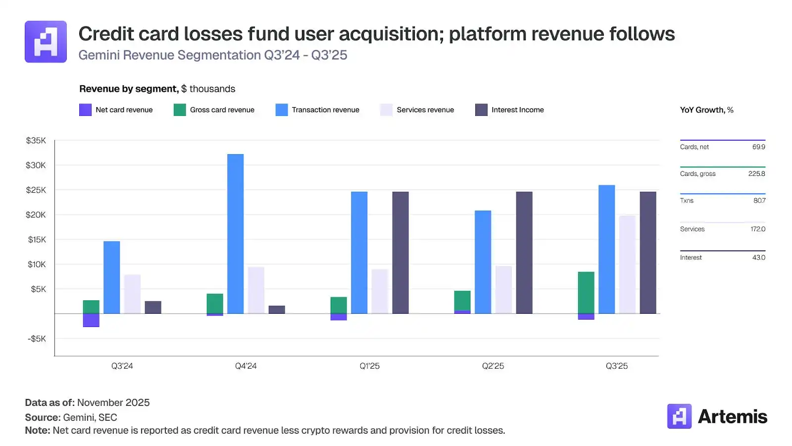 以法币或流动性强的加密货币(如 Gemini、Coinbase、Kraken)支付奖励的 CEX 会产生实际的美元成本,必须依靠交易手续费、利息收入和资产收益来弥补客户获取成本。在 2021 年 1 月收购 Blockrize 之后,Gemini 于 2022 年推出了带有加密货币返现奖励的信用卡计划。尽管 Gemini 信用卡业务持续亏损(见下图紫色部分显示的净信用卡收入),但由于其在用户获取和留存方面表现出色,Gemini 仍继续投资并运营其信用卡产品。