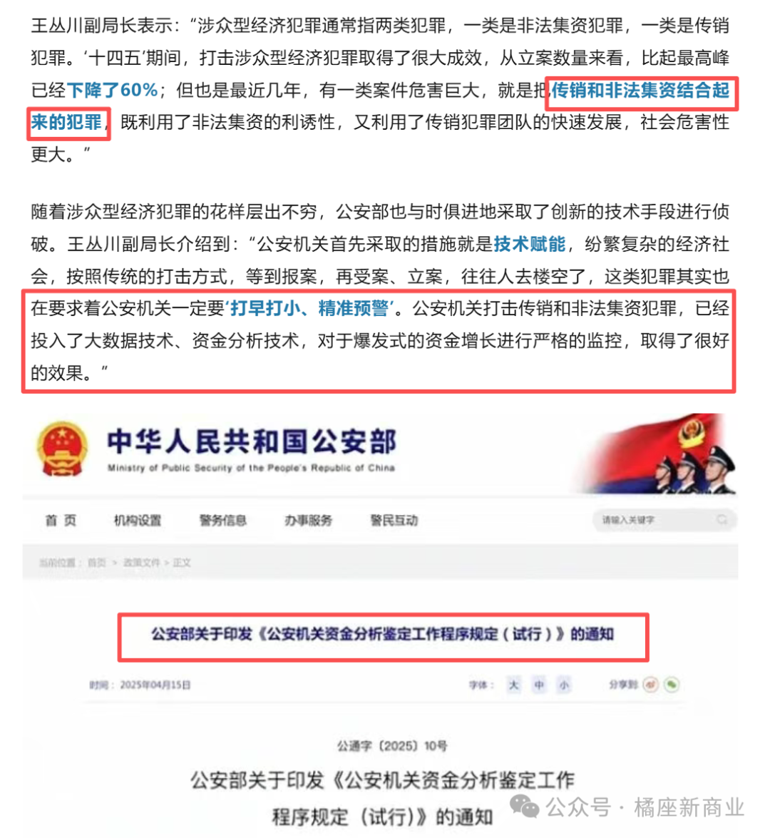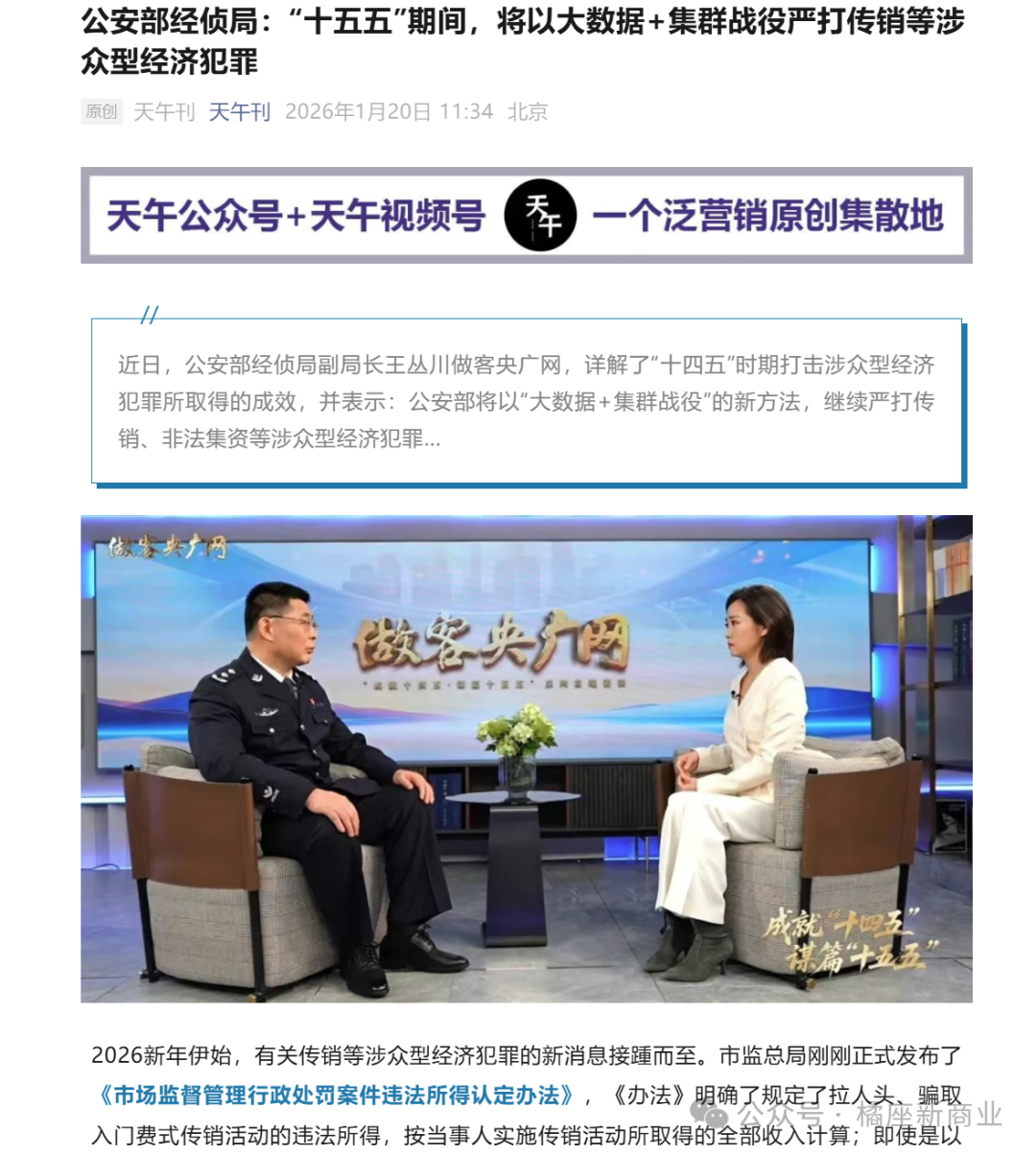 同样在今天,公安部经侦局的王副局也在央广网上表态,十五五期间将以大数据+集群战役严打传销等涉众型经济范围。