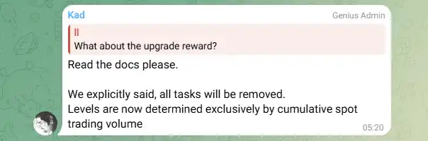 正如官方 Telegram 中团队成员对新规则的解释,一方面,此前所有的 GP 任务积分(交易任务+邀请任务)全部被清除;另一方面,新规则下仅能通过现货交易产生交易量获得 GP 积分。