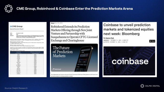 市场已从分众小众领域涵盖成为一个超过6亿美元规模的类别。下一个阶段会关注子?大型机构正竞相入场:CME集团(芝商所)计划推出体育市场,Coinbase正在启动预测市场,而Robinhood则收购了MIAXdx以提供内部市场,从而减少对Kalshi的依赖。目前,Polymarket和Kalshi正在积极拓展市场工具。