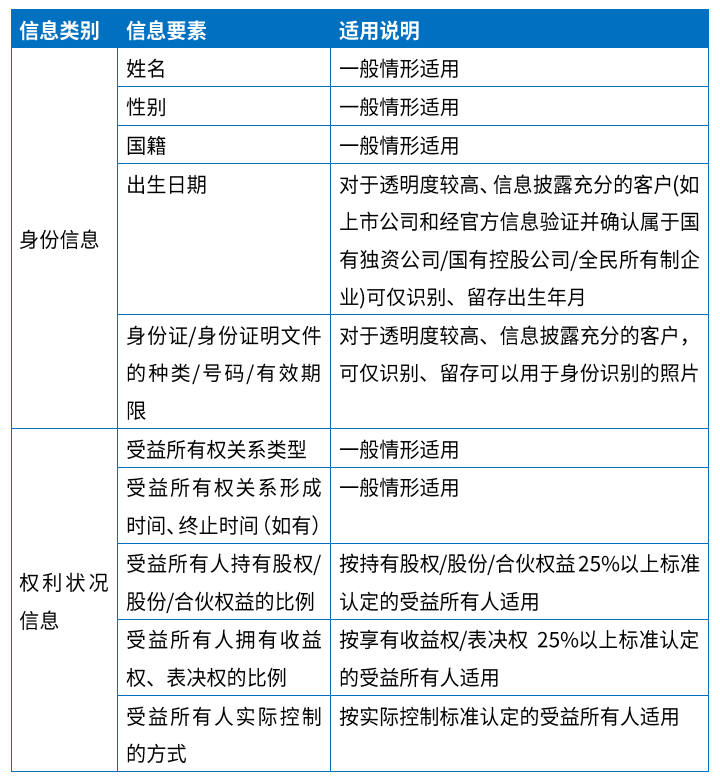 就信息要素而言,12号令明确需要收集和留存的受益所有人两类核心信息,包括身份信息和权利状况信息。并对不同识别标准下的权利状况信息作了细化要求: