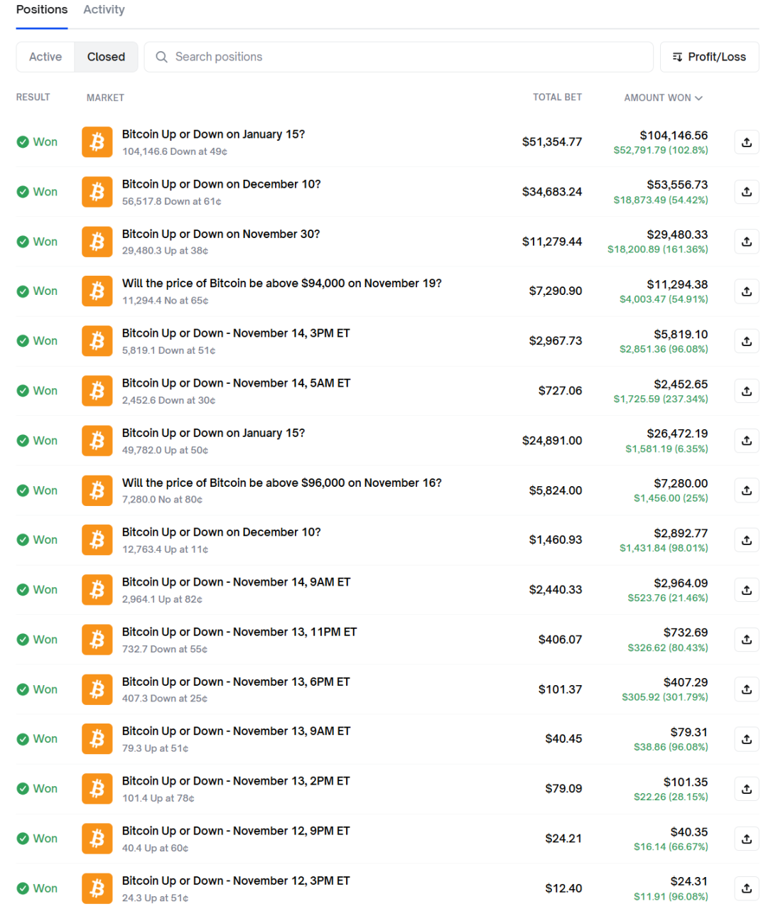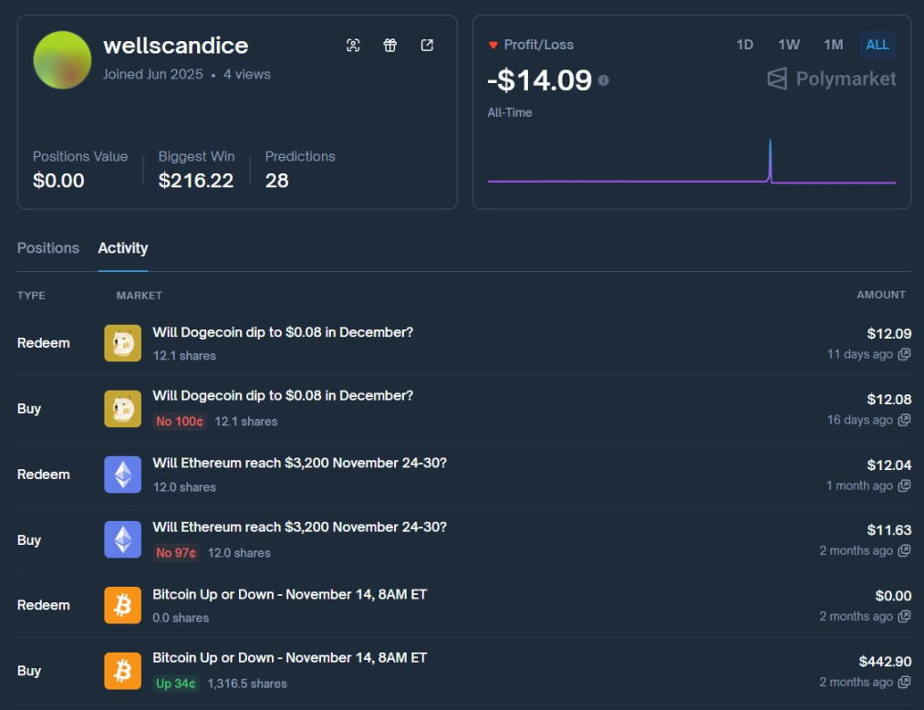 交易行情获取财富的场所,早已不再局限于交易所以及 DEX 了。想象一下当你打开 Polymarket 页面,坐在电脑前,盯着比特币的价格走势图。屏幕上,Polymarket 平台的界面闪烁着橙色的比特币图标,你下注了全部身家——仅仅 12 美元——押注比特币在某个时间段内会上涨。市场赔率高度不确定,但你凭借对链上数据、新闻动态和 K 线形态的分析,几小时后,市场结算,你赢了,账户余额翻倍到 24.31 美元。不过这只是开始。你深吸一口气,继续全仓押注下一次,你又赢了,余额变成 40.35 美元。就这样,一次次全仓操作,你像滚雪球一样积累胜利。