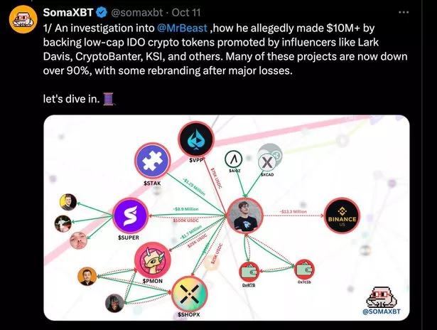 去年 10 月,就在 MrBeast 注册那个商标的同一周,链上侦探 SomaXBT 发了一串推文,指控 MrBeast 在2021 年参与多个加密项目时,拿到项目方给的低价币,等公开发售价格拉起来,然后砸盘走人。