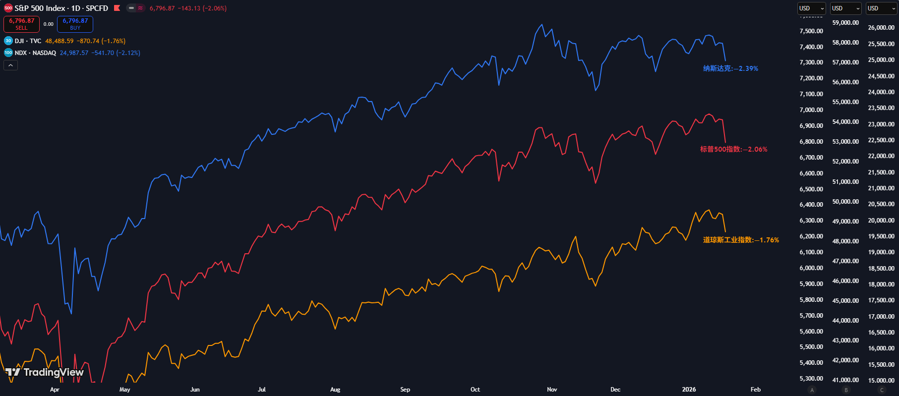 果不其然,昨晚美股市场的惨烈表现与我在昨日的文章中所提到的预想大差不差。美股市场在度过周一的马丁路德金纪念日假期后,迎来了2026年首场惨烈且沉重的“开门黑”。