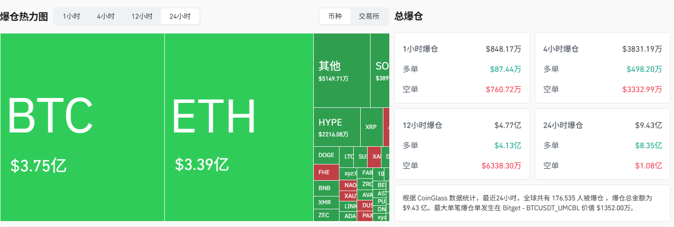 而根据CoinGlass的统计数据显示,在最近24小时内,全球共有176,535人遭遇爆仓,爆仓总金额接近10亿美元,合计9.43亿美元。